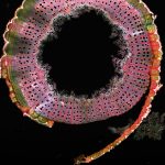 Une coupe de bois de vigne, utilisée pour la production de Spätlese (un vin blanc d’origine allemande issu de raisins récoltés tard dans la saison), est observée en autofluorescence à l’aide d’un scanner de lames InnoQuant. Le titre de l’image rend hommage au film classique « Plan 9 from Outer Space » d’Ed Wood.